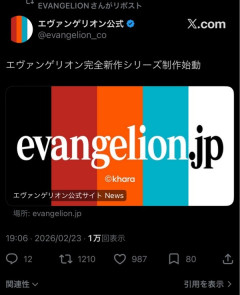 1: 2026/02/23(月) 19:14:41.40 ID:D0F4aB6D0 エヴァンゲリオン完全新作シリーズ制作始動 『エヴァ』30周年を記念するフェス「EVANGELION:30+; 30th ANNIVERSARY OF EVANGELION」最終日である2月23日(月・祝)Final Programにて『エヴァンゲリオン』完全新作シリーズの制作に関する初報を発表致しました。 シリーズ構成・脚本 ヨコオタロウ 監督 鶴巻和哉、谷田部透湖 音楽 岡部啓一 制作 スタジオカラー × CloverWorks…