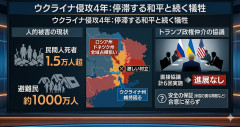 1: 名無し 2026/02/24(火) 10:25:14.22 ID:uK4wN9mR0 ロシアによるウクライナ侵攻は24日で開始から4年を迎えました。トランプ米大統領の復権後、両国は直接交渉による終戦の道筋を模索していますが、領土問題を巡る立場の隔たりは大きく戦争は長期化する可能性が高いとみられています。 国連機関のデータによれば、この4年間で1万5千人以上の民間人が犠牲となり、国内外で約1千万人が避難を強いられるなど市民生活への甚大な被害が続いています。 現在もウクライナ領土の約2割がロシアに占領されており、戦況は膠着状態にあると分析されています。 Yahoo!ニュース ■要約 ・ウクライナ侵攻開始から4年が経過 ・民間人の死者は1万5千人超で避難民も約1千万人 ・トランプ政権仲介の直接協議は計6回実施されるも進展なし ・ドネツク州全域の占領を狙うロシアと維持を図るウクライナで対立 ・米国の関与期間など安全の保証についても合意に至らず 作家で元※※女優の鈴木涼美さん、高市首相を「デビューしたてのキャバ嬢の振る舞い!」と揶揄 www... 【速報】 中国で目撃が相次ぐ「日本の無条件降伏」祝うボディーステッカーの車、日産の車だという渾身のギャクが発生wwww 【速報】 トランプ大統領、突然「グリーンランドに病院船派遣」 現地首相は「結構です」…