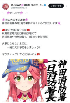 1: 名無しのアニゲーさん 2026/02/24(火) 14:29:03.626 ID:FzmWH7FV9 ⋱ 🌸おしらせ🌸 ⋰🌸春の火災予防運動🌸神田消防署の1日消防署長にさくらみこ就任します🎉🚒3/3(火)10時~12時🚒秋葉原駅電気街口駅前広場にて防災訓練や特別映像も!(誰でも参加可能)火事にならないように、 一緒に火災予防をしましょう‼ぜひチェックしてくださいにぇ🚒…