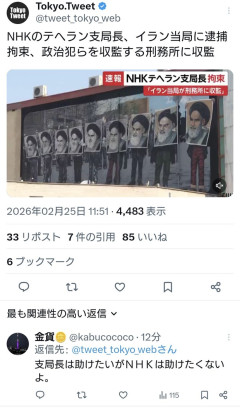 1:2026/02/25(水) 12:19:39.25 ID:Re2XSrxH0日本政府「邦人1名が1月20日に拘束された」NHKテヘラン支局長をイラン当局が身柄拘束か…刑務所収監の情報ものテヘラン支局長、イラン当局に逮捕拘束、政治犯らを収監する刑務所に収監 pic.twitter.com/ruqxnOQHOe— Tokyo.Tweet (@tweet_tokyo_web) February 25, 2026転載元スレッド:…