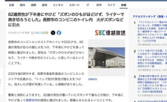 1 : 23日午後5時半すぎ、長野市真島町真島のコンビニエンスストアの店員から、「トイレで80代男性が服に火をつけた。消火したが煙が充満している」と通報がありました。 警察と消防によりますと、82歳の男性が履いていたズボンや下着などが焼け、下半身にやけど負って長野市内の病院に運ばれました。軽傷とみられるということです。 また、コンビニエンスストアの63歳の女性店員も煙を吸って病院に運ばれましたが、軽傷だということです。 またトイレの便座や換気扇カバーも焼けました。 調べに対して、男性は「ズボンのひもがほどけなくなり、ライターで焼き切ろうとした」と話しているということです。…