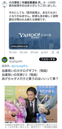 1: 太陽(東京都) [ニダ] 2026/02/25(水) 08:29:44.30 ID:w0l3gAre0● BE:662593167-2BP(2000) sssp://img.5ch.net/ico/taxi.gif 本記事はネット上の反応を整理したものであり、特定の立場を支持するものではありません。 引用元: ・ スポンサーリンク スポンサーリンク 4: はくちょう座X-1(庭) [AR] 2026/02/25(水) 08:33:16.69 ID:Ar2d+xA30 小川は立憲らしいゴミそのもので安心したわw 何一つ生産性のない質問の数々 このひとの質疑聞いてるくらいなら公園に屯する鳩でも見てた方が遥かに有意義だわw 左派クは鳩みたいで学習ってしないから楽だよなw 42: 海王星(奈良県) [BR] 2026/02/25(水) 09:13:55.64 ID:V0PgtzJu0 >>4 ほんとそれな! wwwwww 5: アルデバラン(ジパング) [US] 2026/02/25(水) 08:34:15.72 ID:Y+qv96Vx0 こういう野党のブーメランをワイドショーは特集すべき ネット漁ればいくらでも出てくるし視聴率取れると思うんだけどな 7: エイベル2218(東京都) [CN] 2026/02/25(水) 08:35:01.77 ID:Z+bdeKIr0 説明責任と言うならお前のとこの元幹事長に惨敗の説明をさせるのが先なんじゃね? 偉そうにクリームパン食ってていざとなったらコソコソと逃げ足だけは早かったけどw 8: アクルックス(東京都) [ニダ] 2026/02/25(水) 08:35:09.09 ID:bENacZrK0 同じ選挙区でない限り 政治家同士の場合は収賄にならない 11: テチス(茸) [DK] 2026/02/25(水) 08:35:55.22 ID:wkjuyTNl0 ブーメラン技術は必修なん? 13: 太陽(やわらか銀行) [CN] 2026/02/25(水) 08:36:35.28 ID:q/iqJ4QM0 本当に違法だと思ってるなら国会議員を1年生からやり直せ 14: アクルックス(東京都) [ニダ] 2026/02/25(水) 08:38:06.89 ID:bENacZrK0 政治家同士のやり取りを問題視すると 政党政治が成り立たなくなるからな いっちょ噛みし過ぎだよ 16: ニクス(庭) [ニダ] 2026/02/25(水) 08:38:39.10 ID:zKZ8iNsn0 馬鹿の一つ覚えの揚げ足取りも大敗の原因だとわからないらしい 19: アルデバラン(庭) [CN] 2026/02/25(水) 08:40:01.30 ID:kf5ozKke0 これは追及しないと国民も納得しないだろ 23: エリス(庭) [ニダ] 2026/02/25(水) 08:41:24.50 ID:+WS+7pFJ0 >>19 まずは小川自身が花束の説明責任を果たすべき 27: 大マゼラン雲(愛知県) [US] 2026/02/25(水) 08:45:54.68 ID:KA+YBG9+0 >>23 この花束はどこから出ているんだろ?? 小川が自分で買ったのか 党から出ている? 21: エイベル2218(愛知県) [US] 2026/02/25(水) 08:40:20.45 ID:nzI3tNX60 もうそんな所に時間とるなよマジでうんざりする 24: はくちょう座X-1(庭) [AR] 2026/02/25(水) 08:41:43.74 ID:Ar2d+xA30 立憲さんは後4年裏金で頑張るんですね(笑) 誰だよいまだ立憲に入れてる知的障害者は 26: 子持ち銀河(庭) [CN] 2026/02/25(水) 08:43:54.36 ID:M4PWkQ+Q0 何も変わらないゴミで安心した どいつもこのひとも復活のチャンスを自らダメにしていくな 28: ダークマター(庭) [ニダ] 2026/02/25(水) 08:49:05.61 ID:iMFpbIbb0 そのうち必勝ダルマも ダルマ屋への利益誘導とか言い出し兼ねないな 30: ビッグクランチ(東京都) [ニダ] 2026/02/25(水) 08:51:54.07 ID:KDmFZjhB0 野党は手ぐすね引いてアラ探しと国会空転の機会をうかがってるんだから、こういう隙は作ってほしくなかったけどな 国庫に入った金や自民党が内部留保している金を法に触れない範囲でどう使おうが、それはどうぞご自由にだけど 国会が空転するのは国と国民の損失 予算の年度内成立を目指すならそこに集中して、余計なことは後回しにして欲しかった でないとアホな人達に国会から退場頂いた意味がないじゃん 36: ミラ(茸) [DE] 2026/02/25(水) 08:59:53.26 ID:q3GUULqy0 >>30 100%空転するんだから こういうどうでもいい穴作って そこに攻め込ませるのは本当の策士 城もあえて弱いところを作って 相手にそこに来させる 78: ビッグクランチ(東京都) [ニダ] 2026/02/25(水) 11:32:15.46 ID:KDmFZjhB0 >>36 それで野党がカタログギフト問題やるもんだから予算の年度内成立するために強行採決するしかありませんでした ってオチにするなら本末転倒だよ 大局的に見るならジミンガーがヤトウガーになるだけでしかない まあ物事が決まるだけ今までよりはマシだけどな 37: 海王星(奈良県) [BR] 2026/02/25(水) 09:05:08.58 ID:V0PgtzJu0 これで国会を1ヵ月空転させるんだろう 予算案の年度内成立の阻止が目的なんだろうな 全くおんなじだよな 変わんねー 生活者セカンドだよ全く! 38: プロキオン(埼玉県) [US] 2026/02/25(水) 09:05:57.28 ID:sl9XYMak0 国民の生活よりカタログギフトの中身が気になって仕方ない中核連 39: バーナードループ(東京都) [US] 2026/02/25(水) 09:06:03.03 ID:843qu1de0 マスコミも野党もなんでこんな自民党が勝っちゃったかを理解してないな 40: ダークマター(大阪府) [ニダ] 2026/02/25(水) 09:12:40.96 ID:mRdYqdak0 代表変わっても同じ路線なんだなと 44: デネブ・カイトス(やわらか銀行) [US] 2026/02/25(水) 09:14:41.45 ID:/fXmQTRe0 >>40 邪魔するしかやる事ないんだよ やっぱこのひとらいらんよな 45: プレセペ星団(東京都) [US] 2026/02/25(水) 09:20:13.22 ID:8gnma25o0 説明責任が問われるってどういう意味だよ 気持ち悪い日本語だな 49: アルデバラン(庭) [CN] 2026/02/25(水) 09:27:00.74 ID:kf5ozKke0 本人認めちゃったのかwww 石破の時に先頭に立って批判してた高市 野党とマスコミは徹底的に追及して欲しい 62