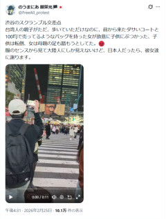 1: 2026/02/25(水) 14:10:15.842 渋谷のスクランブル交差点台湾人の親子がただ、歩いていただけなのに、前から来たダサいコートと100均で売ってるようなバッグを持った女が故意に子供にぶつかった、子供は転倒、女は母親の足も踏もうとしてた。😡服のセンスから見て大陸人にしか見えないけど、日本人だったら、彼女達に謝ります。 pic.twitter.com/6idazH4p7G— のうまにあ 願榮光🏴🇯🇵 (@FreeAll_protest) February 25, 2026 Threadsで見る この投稿をInstagramで見る 甜點兒林佩佩(@peipeilin527)がシェアした投稿ちなみに被害者は台湾人観光客台湾でめちゃくちゃ炎上してて日本旅行ボイコット運動まで発展してる ※関連記事 【動画】女性さん、歩道をチャリで爆走していたらオッサンと肩がぶつかり車道に吹っ飛ぶwwwwwww…