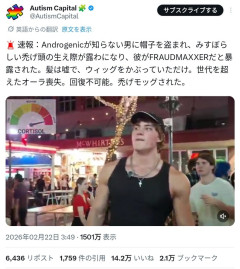 引用元: それでも動く名無し 2026/02/26(木) 00:44:45.15 ID:Ga1fGrxcd 24歳のインフルエンサー、街頭でライブ配信中に帽子ごとウィッグをはぎ取られ薄毛があらわになった瞬間「取り返しがつかない屈辱」に激怒 2/25(水) 20:50配信 ライブ配信中に帽子ごとウィッグをはぎ取られ、薄毛をさらされた豪インフルエンサーの動画が1200万回以上再生され話題を呼んでいる。 米「ニューヨーク・ポスト」紙によると、筋トレや男性性を語るアンドロジェニック(24)は、黒い帽子とウィッグを着用して街中でライブ配信をしていると、背後から近づいてきた男に帽子を奪われ、生え際の後退した頭部が露出。怒って追いかける場面で映像は終わる。 コメント欄では「取り返しがつかない屈辱」と嘲笑する声もあったが、「意地悪で処罰対象だ」と擁護するコメントもみられた。同氏は、以前からウィッグ着用を公表していたと反論している。 30: それでも動く名無し 2026/02/26(木) 01:11:48.96 ID:moY8gZ/h0 >>1 20代でハゲってヤバくね????? 3: それでも動く名無し 2026/02/26(木) 00:46:15.33 ID:Ga1fGrxcd 日本語訳したらなんか酷いこと言われてる……