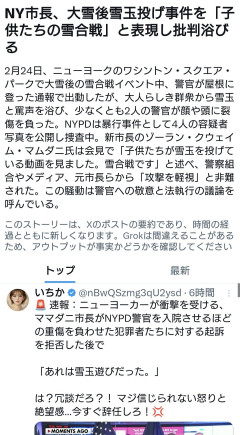 NYのマムダニ市長、警察官が顔や頭に雪玉を投げつけられ怪我をした事件にコメントして炎上「子供たちの雪合戦だ」