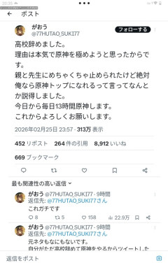 1: 2026/02/26(木) 20:36:08.270 高校辞めました。理由は本気で原神を極めようと思ったからです。親と先生にめちゃくちゃ止められたけど絶対俺なら原神トップになれるって言ってなんとか説得しました。今日から毎日13時間原神します。これからよろしくお願いします。— がおう (@77HUTAO_SUKI77) February 25, 2026 ※関連記事 本屋さん、原神に侵食される…
