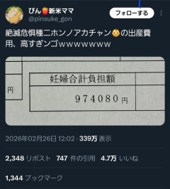 1: 2026/02/26(木) 17:11:28.91 絶滅危惧種ニホンノアカチャン👶の出産費用、高すぎンゴwwwwwww pic.twitter.com/3GHr54jAaQ— ぴん🍟新米ママ (@pinsuke_gon) February 26, 2026 ※関連記事 【大惨事】『出産の痛み体験マシン』を使用させられた男性、腸が壊死…