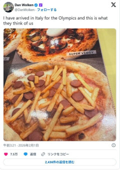 1 : ミラノ・コルティナ冬季オリンピックの選手村で提供された「アメリカーナ」ピザの写真をめぐり、SNS上で議論が白熱している。話題は、ピザの本場が抱く「アメリカ人の味覚観」についてだ。 ヤフーニュースのシニア記者ダン・ウォルケンが会場で撮影した写真には、スライスしたホットドッグのような丸い肉とフライドポテトがトッピングされたピザが映っている。 ウォルケンは投稿に「オリンピックのためにイタリアに到着した。そして、これが彼らが私たちをどう見ているかだ」と添えた。 この投稿は420万回以上閲覧され、多くのユーザーがコメントを寄せている。 NFLフィラデルフィア・イーグルスで長年センターを務め、トラビス・ケルシーの兄でもあるジェイソン・ケルシーもこの投稿を再共有。 「よくもこんなことをしてくれたな!! それと、ちょっと聞きたいんだけど、ランチ(ドレッシング)はあるのか? それとも自分で持っていくべき?」とアメリカの定番ドレッシングを 引き合いにジョークを飛ばした。 100万人以上のフォロワーを抱えるスポーツ系インスタグラムアカウント、ジョンボイ・メディアもウォルケンの投稿を再共有し、「イタリアが私たちに敬意を表して、ピザにフライドポテトとホットドッグをのせている」とキャプションを添えた。 「ピザの都」ナポリを擁するイタリアのイメージを踏まえ、この表現に不快感を示すユーザーもいる一方で、どんなソースを合わせるかといった話題で笑い飛ばす声も上がっている。…