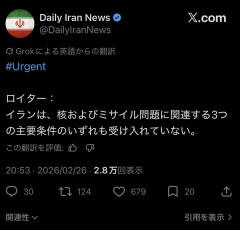 1: それでも動く名無し 2026/02/26(木) 22:33:10.07 ID:RhZzRZef0 おお 2: それでも動く名無し 2026/02/26(木) 22:33:48.14 ID:RGx71vKO0 ドンパチくるか 3: それでも動く名無し 2026/02/26(木) 22:35:55.36 ID:tbLKLIqS0 そりゃな アメリカが攻撃するための大義名分ってだけやし 8: それでも動く名無し 2026/02/26(木) 22:42:55.83 ID:QIqoR+p6r 「はい、やっぱ核開発やめます」って言って裏でこっそり作ればええやん 引用元: ・…