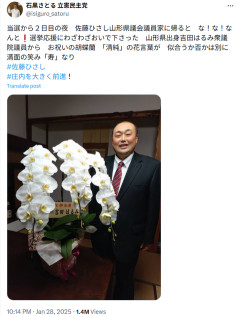 1: 名無しさん@ 2026/02/27(金) 12:51:27.27 ID:5BsM+gjl0 BE:158879285-PLT(16151) 当選から2日目の夜 佐藤ひさし山形県議会議員家に帰ると な!な!なんと❗選挙応援にわざわざおいで下さった 山形県出身吉田はるみ衆議院議員から お祝いの胡蝶蘭 「清純」の花言葉が 似合うか否かは別に 満面の笑み「寿」なり #佐藤ひさし #庄内を大きく前進! アカウントを消して逃亡 3: 名無しさん@ 2026/02/27(金) 12:53:18.22 ID:C7d9zyKE0 三万円で買えるの? 5: 名無しさん@ 2026/02/27(金) 12:58:50.91 ID:MwjCZxkb0 これか おやっ… 23: 名無しさん@ 2026/02/27(金) 13:24:24.40 ID:wK601WYq0 >>5 これ3万円で買える? もっとしそうだな。 6: 名無しさん@ 2026/02/27(金) 12:59:57.78 ID:eKMZCsC80 垢消し草 選挙後の風物詩の胡蝶蘭を今更消し去るなんて無理だろ笑馬鹿じゃん 9: 名無しさん@ 2026/02/27(金) 13:08:01.11 ID:hEJ5duXV0 おいおい議員が垢消しはダメだろwwwwwww 11: 名無しさん@ 2026/02/27(金) 13:13:13.12 ID:OAPQwcfd0 胡蝶蘭販売は選挙が書き入れどきだよな 当選祝い用大輪の3本立ちだと最低3万 昔からじゃん 12: 名無しさん@ 2026/02/27(金) 13:14:27.08 ID:MU6eDPha0 垢ごと消すなよw 16: 名無しさん@ 2026/02/27(金) 13:17:59.90 ID:bLIYYh3H0 垢消しブーメランは草 17: 名無しさん@ 2026/02/27(金) 13:18:46.81 ID:YkD1m3OL0 あれ一本で一万円なんやろ💐 19: 名無しさん@ 2026/02/27(金) 13:22:21.74 ID:0wpa9US60 ママ、大ブーメラン刺さったんか? 22: 名無しさん@ 2026/02/27(金) 13:23:37.00 ID:r9aSa/r00 いい加減ブーメランを捨てろ 34: 名無しさん@ 2026/02/27(金) 13:46:30.37 ID:KusLGnJY0 カタログギフトなら高級和牛とか貰えるから大問題だな 44: 名無しさん@ 2026/02/27(金) 13:58:30.17 ID:wK601WYq0 >>34 だな。 胡蝶蘭は3万円超えてても飾るだけで食えないからなw 36: 名無しさん@ 2026/02/27(金) 13:51:13.26 ID:xV0uiCjx0 コレ花が意外と日持ちする 42: 名無しさん@ 2026/02/27(金) 13:56:35.84 ID:IVrNiaL90 これは祝いなんだから、ともはや意味不明の反論しろよ 55: 名無しさん@ 2026/02/27(金) 14:46:48.57 ID:VrIKR4Va0 垢消ししたら後ろめたいと白状したのと同じ マスゴミが報道しない自由を行使してもネットで拡散されたらより印象が悪くなるぞ 57: 名無しさん@ 2026/02/27(金) 15:00:13.74 ID:lBK0c4K/0 消してて草 66: 名無しさん@ 2026/02/27(金) 15:40:24.53 ID:3GqC2VZB0 胡蝶蘭は突然の衆院選でコチョウラン「特需」 需要低迷期に出荷急ピッチ 2026年1月30日 19時00分 ≡≡≡≡≡⊂`⌒m9^Д^)⊃プギャー! 引用元…