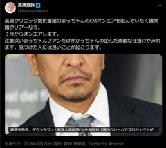 1: 名無し 2026/02/27(金) 06:16:37.86 ID:QG24CIQH9 高須克弥@katsuyatakasu高須クリニック提供番組のまっちゃんのCMオンエアを阻んでいたく諸問題クリアーなう。3月からオンエアします。注意深いまっちゃんフアンだけがかっちゃんの企んだ素敵な仕掛けがみれます。見つけた人には良いことが起こります。…