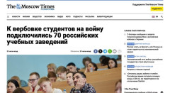 1 : К вербовке студентов на войну подключились 70 российских учебных заведений (学生の戦争への勧誘に70のロシアの教育機関が関与している。) 国防省との契約締結は「人生の重要な出発」として提示されている。例えばモスクワのプレハノフ名ロシア経済大学(РЭУ)は「学業を中断せずに」勤務でき、学費免除(予算扱い)への移行を提案している。サンクトペテルブルク国立大学(СПбГУ)は志願者に一時金5万ルーブルとその後の学業継続の機会を約束している。高等経済学院(ВШЭ)は勤務期間中の学業休職を保証し、ロシア技術大学(RTU МИРЭА)は成績不振の学生の未履修科目を免除することを約束している。 同時に、学生にはしばしば圧力がかけられている。勧誘の集会への出席を義務づけ、不参加には懲戒処分を予告し、「臆病者」と呼び、入隊を拒否した場合には「裏切り者」についての映画を見せるよう強制する(ノヴォシビルスクの交通技術カレッジでの事例)。成績が低い学生は指導部に呼び出され、退学をほのめかして脅されている。…