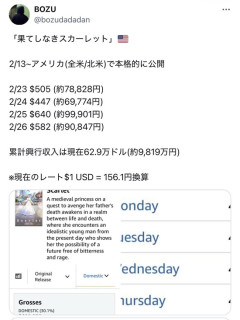 【画像】映画「果てしなきスカーレット」北米興収1億円届かず…