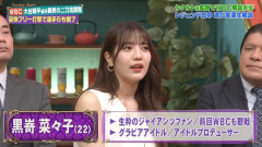 1:名無しさん 2026/03/01(日) 15:33:55.484 ID:O1m.ImXiC 人気グラドルが“未成年飲酒”疑惑を釈明 WBC観戦巡る『サンジャポ』での発言は「誤解を招く表現」 タレントでグラビアアイドルの黒嵜菜々子(22)が3月1日、自身のXを更新。同日に生出演したTBS系『サンデー・ジャポン』での発言について「誤解を招く表現」があったとして謝罪した。 番組では、5日に開幕するWBCの話題を特集。生粋のジャイアンツファンとして紹介された黒嵜は、爆笑問題の田中裕二から「野球大好き女子」と振られると「めちゃめちゃ大好きです。好きすぎて、前回のWBC、ひとりで行きました」と2023年3月に行われた前回大会を観戦したことを明かした。 さらに「ビール飲みながら隣のおじさんと『イエー』とやって」と当時の様子を語ったが、この発言を受け、SNS上では「前回のWBCのときまだ二十歳になっていなかったのでは」「3年前ということは未成年飲酒ではないか」といった疑問の声が上がっていた。23年3月当時、黒嵜は19歳だった。(オリコン) 9:名無しさん 2026/03/01(日) 15:35:24.899 ID:OWZuUl0tA 年齢の方が嘘なんちゃう 76:名無しさん 2026/03/01(日) 15:44:06.611 ID:xKwSPZKQi 年齢詐称は基本…