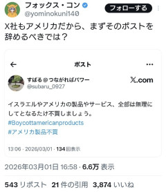 1:2026/03/01(日) 19:27:16.53 ID:gmCJyQdr0X社もアメリカだから、まずそのポストを辞めるべきでは? pic.twitter.com/IoHQ5wC6Gn— フォックス・コン (@yominokuni140) March 1, 2026転載元スレッド:…