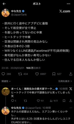 1: 2026/03/02(月) 10:12:07.19 ・欧州に行く途中にアブダビに着陸・そして航空便が全て停止・冬服しか持ってないのに中東・ヒートテックで中東・空港は閉鎖され再開の見込みなし・外食は日本の2-3倍・WifiつなぐとLINE通話/Facetimeが不可(政府制限)・寿司屋がなんか黄色い寿司しかない・住んでる日本人もなんか怪しい— ゆな先生 (@JapanTank) March 1, 2026 ※関連記事 【画像】この漫画の「ダメ人間」と付き合っている彼女の話、少し怖くて草wwwww…