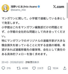 1: 2026/03/03(火) 09:49:22.96 マンガワンに関して。小学館で連載している身として発言します。小学館はこれをマンガワン編集部だけの問題とせず、小学館の全社的な問題として向き合ってください。…— 浅野いにお/Inio Asano (@asano_inio) March 2, 2026 ※関連記事 【悲報】小学館、逝く。漫画家から性暴力を受けていた教え子にとんでもない示談を要求していたことが判明…