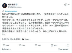 転載元: それでも動く名無し 2026/03/03(火) 15:13:35.93 ID:qndY+Wky00303 高市総理、「SANAE TOKEN」について注意喚起 「私は全く存じ上げません」 10: それでも動く名無し 2026/03/03(火) 15:39:34.66 ID:RthmoTqE00303 【速報】金融庁、首相名の仮想通貨を調査へ 金融庁が高市早苗首相の名前入りの暗号資産(仮想通貨)「SANAE TOKEN」に関し、 関連業者への調査を検討していることが3日、分かった。 携わったとされる企業は、仮想通貨の発行に必要な登録がなく、 事実関係を確認する。 2: それでも動く名無し 2026/03/03(火) 15:14:23.70 ID:qndY+Wky00303…