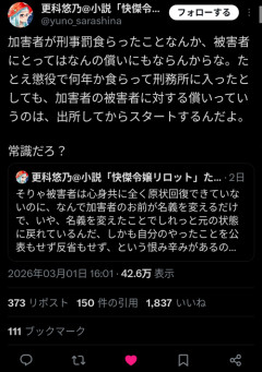 1: 2026/03/04(水) 00:27:15.96 加害者が刑事罰食らったことなんか、被害者にとってはなんの償いにもならんからな。たとえ懲役で何年か食らって刑務所に入ったとしても、加害者の被害者に対する償いっていうのは、出所してからスタートするんだよ。常識だろ? — 更科悠乃@小説「快傑令嬢リロット」ただいま連載中!@空想科学小説作家 (@yuno_sarashina) March 1, 2026 ※関連記事 【悲報】小学館、逝く。性加害で引退した漫画家に別の偽名で漫画を描かせていたことが判明…