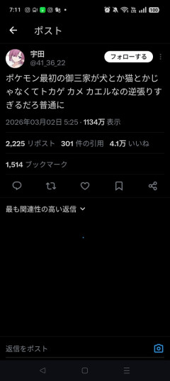 1: 2026/03/04(水) 07:12:28.320 たしかに ポケモン最初の御三家が犬とか猫とかじゃなくてトカゲ カメ カエルなの逆張りすぎるだろ普通に— 宇田 (@41_36_22) March 1, 2026 ※関連記事 【画像】この漫画の「ダメ人間」と付き合っている彼女の話、少し怖くて草wwwww…