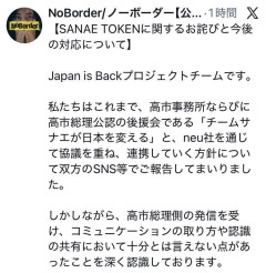 SANAE TOKEN騒動でNoBorderが対応を発表 ホルダーへの補償、名称変更、プロジェクト見直し