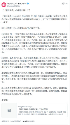 1: 2026/03/05(木) 00:29:59.88 小学館、週刊誌報道で見解 把握している事実説明「この和解協議について、会社ぐるみで関与したとの認識はございません」 小学館は4日、公式サイトを更新し、5日発売の「週刊文春」2026年3月12日号の記事「被害女性が全告白『私は性加害漫画家と小学館を許せない』」について見解を説明した。 【「週刊文春」の報道に関して】「週刊文春」2026年3月12日号(3月5日発売)の記事「被害女性が全告白『私は性加害漫画家と小学館を許せない』」について弊社見解をお伝えします。 弊社が把握している事実は以下の通りです。…— マンガワン/裏サンデー (@MangaONE_jp) March 4, 2026 ※関連記事 【悲報】サンデーの大御所漫画家さん、小学館を擁護して大炎上→ヒロアカの元アシに正論を言われてしまう…