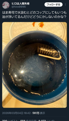 1: 2026/03/05(木) 12:54:18.87 はま寿司で水汲むとどのコップにしてもいつも油が浮いてるんだけどどうにかしないのかな? pic.twitter.com/JegB98VBQt— ヒロは人間失格 (@hiro0096) March 4, 2026 ※関連記事 【朗報】こどおじワイ、仕事納めのお祝いでマッマとはま寿司行ってきたんやが…