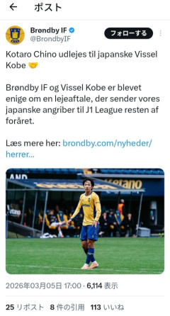 ◆J補強◆ヴィッセル神戸、デンマーク1部ブレンビーFW内野航太郎期限付きで獲得のお知らせ