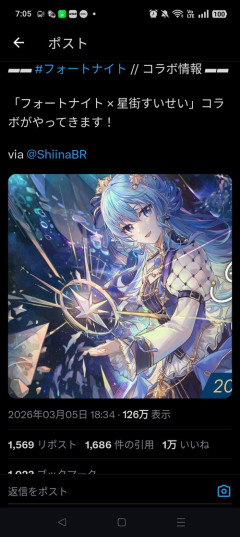 1: 2026/03/06(金) 07:35:53.598 人気ゲームとのコラボが来るかもしれないという噂にブチギレな模様▰▰ #フォートナイト // コラボ情報 ▰▰「フォートナイト × 星街すいせい」コラボがやってきます!via @ShiinaBR pic.twitter.com/V4qu3Pf9OR— Fortnite Info | Green fox (@fn_greenfox) March 5, 2026 ※関連記事 【画像】人気女性Vtuberさん、VIO脱毛をしてしまい界隈が騒然となるwwwwwwww…