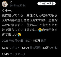 【悲報】女さん「くそー。夜に襲ってくる、異性にしか埋めてもらえない欲求さえなければ男なんか要らないのに。自分が女すぎて悔しい」