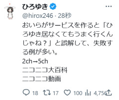 1: 2026/03/06(金) 18:17:23.557 おいらがサービスを作ると「ひろゆき居なくてもうまく行くんじゃね?」と誤解して、失敗する例が多い。2ch→5chニコニコ大百科ニコニコ動画— ひろゆき (@hirox246) March 6, 2026 ※関連記事 【画像】この漫画の「ダメ人間」と付き合っている彼女の話、少し怖くて草wwwww…