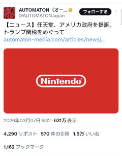 【悲報】任天堂、関税に激怒、アメリカ政府を提訴する