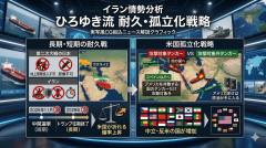 1: それでも動く名無し 2026/03/08(日) 22:05:43.12 ID:HiR0YuKi_2026 ひろゆき氏は、イラン情勢について「第二次大戦の日本と違い、米軍は地上部隊を投入できず原爆も落とせないので、ウクライナと同様の耐久戦になる」と分析。短期では2026年11月の中間選挙、長期では2029年のトランプ大統領の任期終了まで耐えきれば、アメリカ側が折れる確率が上がるとの持論を展開しました。 また、独自の戦略として「アメリカを非難する国(スペインなど)のタンカーだけを攻撃対象外にする」という手法を提案。「アメリカを叩けば原油が手に入る状況」を作ることで、中立や反米に回る国を増やし、米国の孤立を誘うべきだと語っています。 日刊スポーツ ■要約 ・イランは無条件降伏の必要なし。地上戦なき「耐久戦」への持ち込みを示唆 ・2026年中間選挙と2029年トランプ任期終了が勝負の分かれ目と指摘 ・特定国のタンカーのみ見逃すことで、国際社会の分断を図る戦略を提唱 ・「米国に反論した方が得」という状況を作り、米国の外交的孤立を狙うべきと主張 平成元年(1989年)生まれだけどネットが普及したのはスマホからだと思ってる若者ってwww 【WBC】 7日の日韓戦で旭日旗を発見 運営本部に抗議メール「WBC主催側も旭日旗応援を禁止し、強力な措置を要請する」 公明党 ※※地方選で中革を排除、単独で選挙に臨む…
