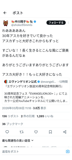 1:それでも動く名無し:2026/03/09(月) 09:22:30.46 ID:cpVdGIeMM 2:それでも動く名無し:2026/03/09(月) 09:23:40.07 ID:fVqQqOSc0 本当に30年前からアスカのこと好きだったんかな? 42::2026/03/09(月) 10:10:12.21 ID:I9WpuHOTa >>2 好きなものが多いだけでしょ🥹 一番好きとは言ってないからセーフ 43:それでも動く名無し:2026/03/09(月) 10:10:16.64 ID:fADqnjRX0 >>2 好きならイベントで見てるわ…