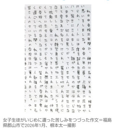中学校の3年生女子生徒が卒業文集にいじめ被害を記した作文を書いたところ、 校長が「楽しかったこともあるはず」と書き直しを命じた。 生徒は泣きながら「うそは書いていない。これが、私の頑張ってきたことです」と拒否し、 保護者の抗議で作文はほぼ原文のまま掲載が決まった。-Grok 1: 煮卵 ★ : 2026/03/09(月) 09:08:50.46 ID:i86Y+xB29 【画像】女子生徒がいじめに遭った苦しみをつづった作文=福島県郡山市で2026年1月、根本太一撮影 引用元: 【福島】「いじめ被害」記した卒業文集、中学校長が書き直し要求…「大人になって読み返してから後悔しないように配慮」 [煮卵★]…