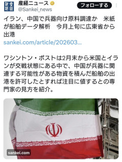 1:2026/03/09(月) 15:25:54.05 ID:X2gsth/d0イラン、中国で兵器向け原料調達か 米紙が船舶データ解析 今月上旬に広東省から出港ワシントン・ポストは2月末から米国とイランが交戦状態にある中で、中国が兵器に関連する可能性がある物資を積んだ船舶の出港を許可したとすれば注目に値するとの専門家の見方を紹介。— 産経ニュース (@Sankei_news) March 8, 2026転載元スレッド:…