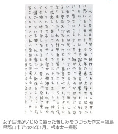 1: ななしさん@発達中 2026/03/09(月) 09:08:50.46 ID:i86Y+xB29 【画像】女子生徒がいじめに遭った苦しみをつづった作文=福島県郡山市で2026年1月、根本太一撮影 福島県郡山市立中学校に通う中学3年の女子生徒が卒業文集に寄せる作文に自身が受けたいじめの被害について書いたところ、校長が書き直しを命じたことが関係者への取材で判明した。 生徒は2025年10月から不登校になっているが、学校はいじめ防止対策推進法に基づく「重大事態」とみなさず、調査もしていない。 生徒側は「いじめをなかったことにしたかったのではないか」と憤っている。 関係者によると、生徒は25年12月、担任から作文の執筆を依頼され、2年生に進級した時に始まったいじめについて記した。 <皆さんのせいで、私の時間と心は確実に傷つきました>と心情をつづった。 後日、学校に呼び出され、校長に「一つぐらいは楽しかったことがあるはずだ」と作文の書き直しを求められた。 生徒は泣きながら「うそは書いていない。これが、私の頑張ってきたことです」と拒否したという。 保護者が抗議したことで、作文はほぼそのまま掲載されることが決まった。 生徒は母親に「校長先生はいじめをなかったことにしたいのかと感じた」と話したという。 中学校側は毎日新聞の取材に、作文を書き直させようとした理由を「大人になって読み返してから後悔しないよう」にという教育的配慮だったと説明した。 【根本太一】 [毎日新聞] 2026/3/9(月) 7:00…