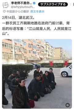 中国の出稼ぎ労働者の一団が政府庁舎の前でひざまずき、未払い賃金の支払いを要求