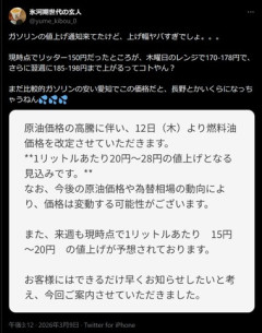 1: 名無し 2026/03/09(月) 18:36:06.08 ID:cd6O4s1M9ガソリン1リットル200円超えの見通し 原油価格の急騰、識者試算…