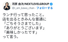 — (@i_am_kawa_chan) 「ネクストレベルホールディングス」代表取締役で実業家・河原由次氏が9日に自身のX(旧ツイッター)を更新し、飲食店で「いただきますと言うべき?」問題で私見を展開した。 河原氏は「ランチ行って思ったこと。店を出るときみんな普通に『ごちそうさまでした』『ありがとうございます』『美味しかったです』って言う」と切り出す。 しかし「普通に考えたら 俺たちお店にご馳走してもらったわけじゃない。普通にお金払ってる」とし「むしろお店側からしたら『食べに来てくれてありがとうございます』やろ。この感覚、俺がおかしいのか?」と投げかけていた。 これに「いただいた命に対しての感謝の言葉だと思います」というコメントが寄せられると、河原氏は「食材には頂きます言うてるで?」と返していた。 ※詳しくは下記リンクより 関連記事 【朗報】YouTubeで天下を取った「マックスむらい」、実業家としても大成功wwwwwww 【伏線回収】人気実業家の与沢翼さん、答え合わせ。 【速報】実業家と結婚した小島瑠璃子(こじるり)の現在がこれ 【画像】金メダリストのアリサ・リウちゃん、アレが判明しアメリカで炎上wwwwwww…