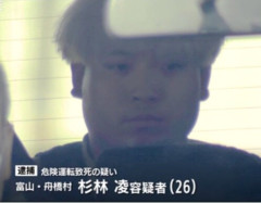 1 : ぐれ ★ : 2026/03/10(火) 15:43:58.75 ID:clkd74Fl9 >>3/10(火) 11:54配信 チューリップテレビ 富山市の国道8号で車同士が衝突し、親子2人が死亡した事故。危険運転致死の疑いで逮捕された男が、140キロを超える速度で赤信号を無視し交差点に進入していたとみられることが捜査関係者への取材で分かりました。 危険運転致死の疑いで逮捕・送検されたのは、舟橋村の会社員、杉林凌容疑者(26)です。 警察によりますと、杉林容疑者は今月7日の早朝、富山市の国道8号で、赤信号を無視して交差点に進入。軽乗用車と衝突し、運転していた上田絵莉加さん(38)と、息子の壮芽さん(14)を死亡させた疑いが持たれています。 ■ブレーキかけずに交差点に進入したか… 捜査関係者によりますと、杉林容疑者は法定速度の60キロを大幅に上回る140キロを超える速度でブレーキをかけずに交差点に進入していたとみられるということです。 また杉林容疑者は「他の車を追い抜こうと思った」という趣旨の供述をしていることも新たに分かりました。 続きは↓…