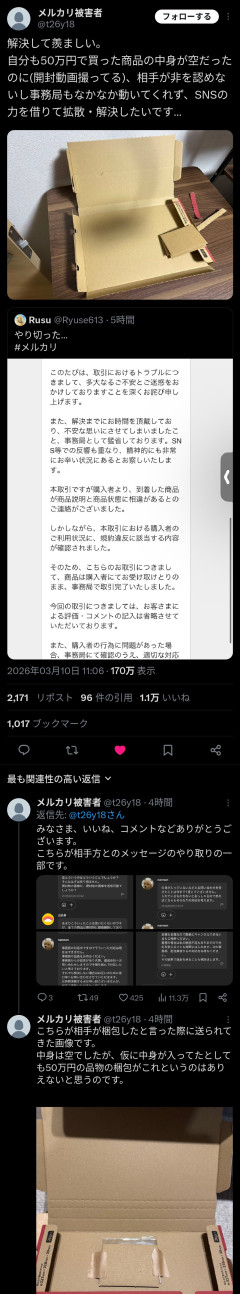 1: 名無しのアニゲーさん 2026/03/10(火) 15:50:48.34 ID:r8K/Btqz0 BE:802034645-2BP(1000) 2: 名無しのアニゲーさん 2026/03/10(火) 15:51:05.78 ID:r8K/Btqz0 BE:802034645-2BP(1000) 開封動画 解決して羨ましい。自分も50万円で買った商品の中身が空だったのに(開封動画撮ってる)、相手が非を認めないし事務局もなかなか動いてくれず、SNSの力を借りて拡散・解決したいです… pic.twitter.com/Kp6Pln0WDl— メルカリ被害者 (@t26y18) March 10, 2026…
