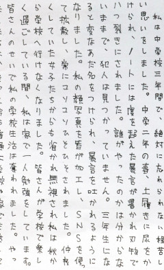 1: 煮卵 ★ 2026/03/09(月) 09:08:50 ID:i86Y+xB29 【画像】女子生徒がいじめに遭った苦しみをつづった作文=福島県郡山市で2026年1月、根本太一撮影 福島県郡山市立中学校に通う中学3年の女子生徒が卒業文集に寄せる作文に自身が受けたいじめの被害について書いたところ、校長が書き直しを命じたことが関係者への取材で判明した。 生徒は2025年10月から不登校になっているが、学校はいじめ防止対策推進法に基づく「重大事態」とみなさず、調査もしていない。 生徒側は「いじめをなかったことにしたかったのではないか」と憤っている。 関係者によると、生徒は25年12月、担任から作文の執筆を依頼され、2年生に進級した時に始まったいじめについて記した。 <皆さんのせいで、私の時間と心は確実に傷つきました>と心情をつづった。 後日、学校に呼び出され、校長に「一つぐらいは楽しかったことがあるはずだ」と作文の書き直しを求められた。 生徒は泣きながら「うそは書いていない。 これが、私の頑張ってきたことです」と拒否したという。 保護者が抗議したことで、作文はほぼそのまま掲載されることが決まった。 生徒は母親に「校長先生はいじめをなかったことにしたいのかと感じた」と話したという。 中学校側は毎日新聞の取材に、作文を書き直させようとした理由を「大人になって読み返してから後悔しないよう」にという教育的配慮だったと説明した。 【根本太一】 [毎日新聞] 2026/3/9(月) 7:00 いじめ被害記した卒業文集、中学校長が書き直し要求「一つぐらいは」(毎日新聞) - Yahoo!ニュース 福島県郡山市立中学校に通う中学3年の女子生徒が卒業文集に寄せる作文に自身が受けたいじめの被害について書いたところ、校長が書き直しを命じたことが関係者への取材で判明した。 生徒は2025年10月Yahoo!ニュース…