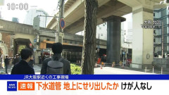 JR大阪駅近くの工事現場 で地中から下水道管が十数メートル突き出す