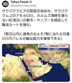 1:2026/03/11(水) 11:19:23.59 ID:c2nOH/9H0サウジアラビアの国営石油会社、サウジアラムコのナセルCEO、ホルムズ海峡を通らない紅海沿いの都市・ヤンブーを経由した輸送ルートを強化。 「数日以内に通常のおよそ7割に当たる日量500万バレルの輸出能力を確保できる」 pic.twitter.com/uyOUOQd1cJ— Tokyo.Tweet (@tweet_tokyo_web) March 11, 2026転載元スレッド:…