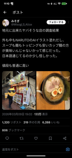 1: 2026/03/12(木) 12:08:36.73 ID:00oD6xQDd 3: 2026/03/12(木) 12:10:57.96 ID:dN8BJM7Kd 草 4: 2026/03/12(木) 12:12:17.76 ID:B38EIAR+0 中国人経営なのに現金のみなのか 5: 2026/03/12(木) 12:12:52.13 ID:rLnvd0QI0 ラーメンの見た目はうまそうやけどな 7: 2026/03/12(木) 12:13:27.42 ID:o6AJ7Udn0 Googleマップはまだコメントないね -->…