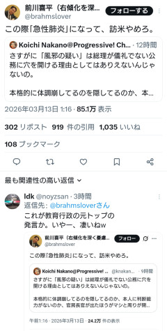 1:2026/03/13(金) 11:58:44.37 ID:HHI0JlrB0人として、Xに書いてはいけない言葉がある。それが分からないのか。 — 渡辺康平 自民党 福島県議会議員(須賀川市、鏡石町、天栄村選挙区) (@kohei_w1985) March 13, 2026転載元スレッド:…