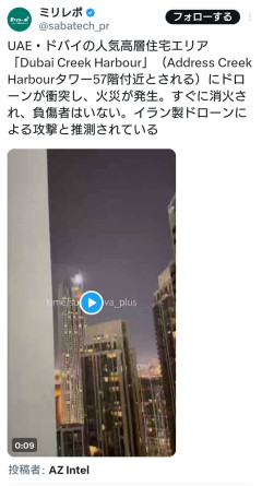 1:2026/03/13(金) 16:26:19.35 ID:9/iRaTIy0UAE・ドバイの人気高層住宅エリア「Dubai Creek Harbour」(Address Creek Harbourタワー57階付近とされる)にドローンが衝突し、火災が発生。すぐに消火され、負傷者はいない。イラン製ドローンによる攻撃と推測されているpic.twitter.com/StgewREIBb — ミリレポ (@sabatech_pr) March 12, 2026転載元スレッド:…