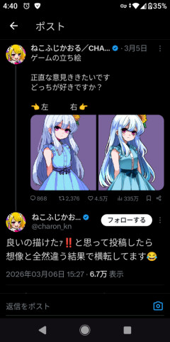 【悲報】ゲームクリエイター「どっちの立ち絵が好きですか?」→片方が圧倒的得票→クリエイター「そっちはAIです……」