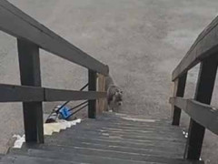 外にいたイヌが階段をのぼってくる。オモチャかな? → ユニークな登り方はこちらです…